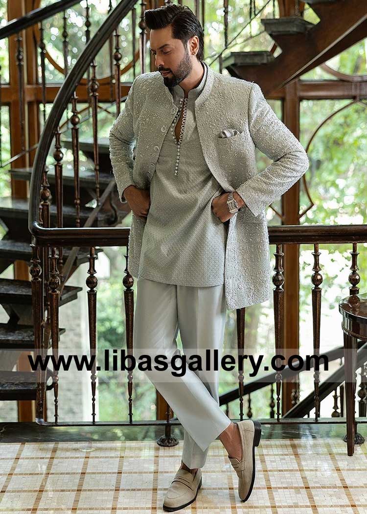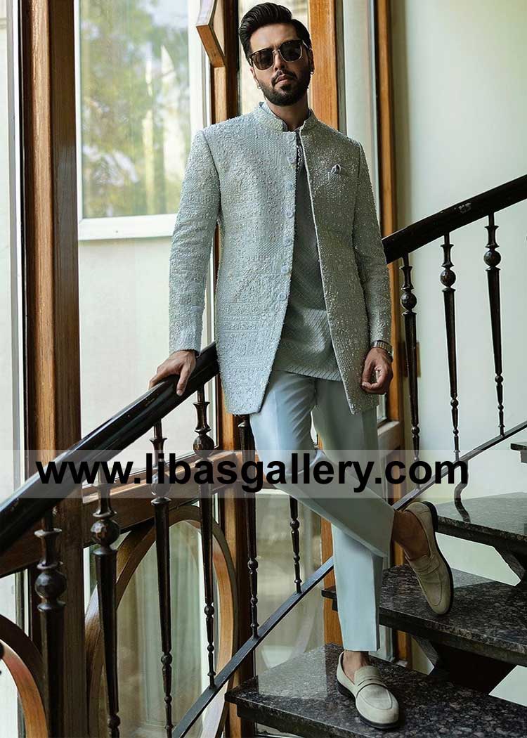 Ice Blue Indo Western Groom Sherwani Cut from an iced blue self jamawar Fabric, the short sherwani Style is elevated using dabka and kora Fancy stitches. This set includes a Karandi shirt and pure raw silk trousers, adding the perfect finishing touches to your Wedding look.Buy online worldwide Shipping by Express Courier