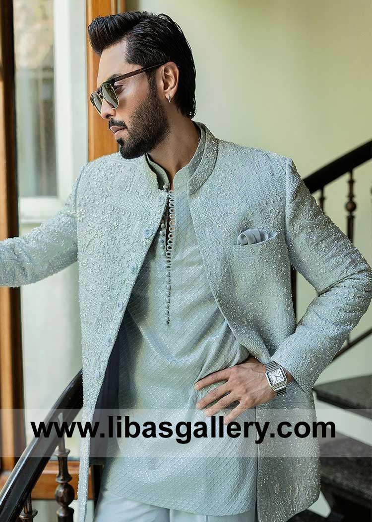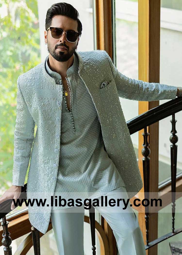 Ornate craftsmanship Ice Blue Short Length Wedding Sherwani for Groom Marriage Event