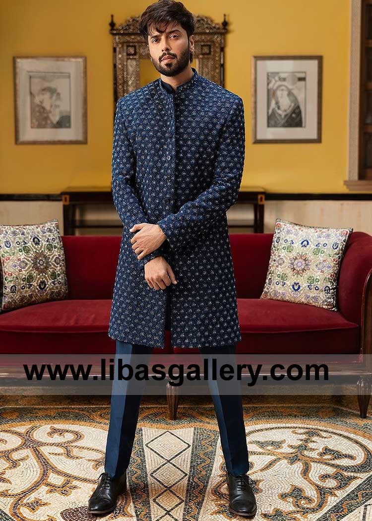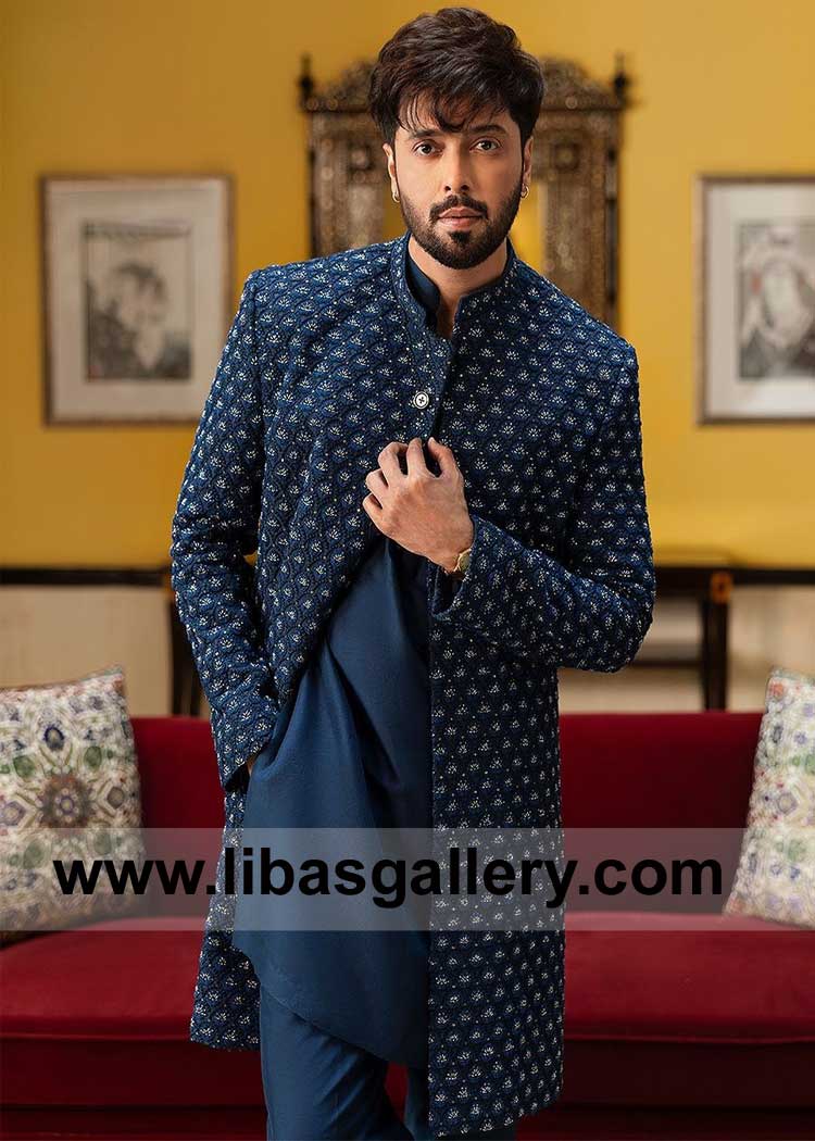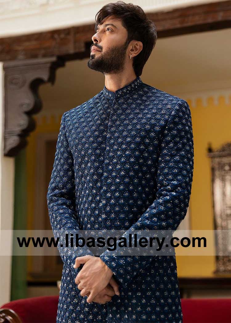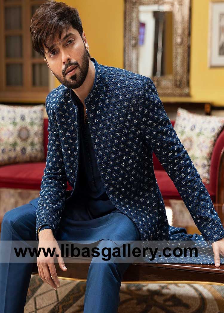 Groom Karandi Wedding Sherwani Style in Navy Blue and Self Jamawar Short length Nikah Sherwani in Ice Blue shade