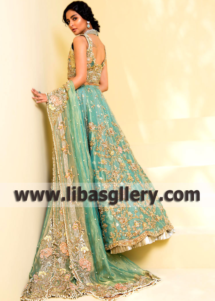This Wedding Lehenge dress is a truly elegant way to walk down the aisle. The Bollywood inspired embellishments are beautifully unique. Lehenga silhouette is delicately decorated with a scalloped hem.