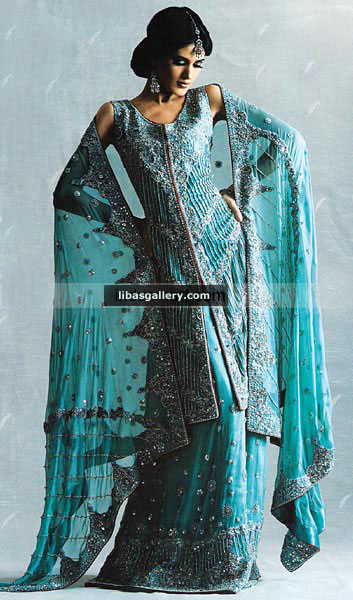 Embellishments made with kora, dabka, naqshi, pearls, sequins, beads, Swarovski crystals, diamantes, marrori, resham and kamdani.