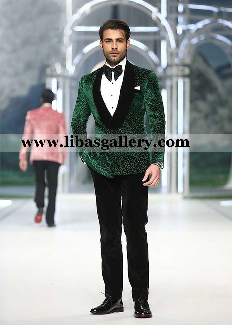 Green Velvet Floral Tuxedo suit double breasted round lapel paired with black pants