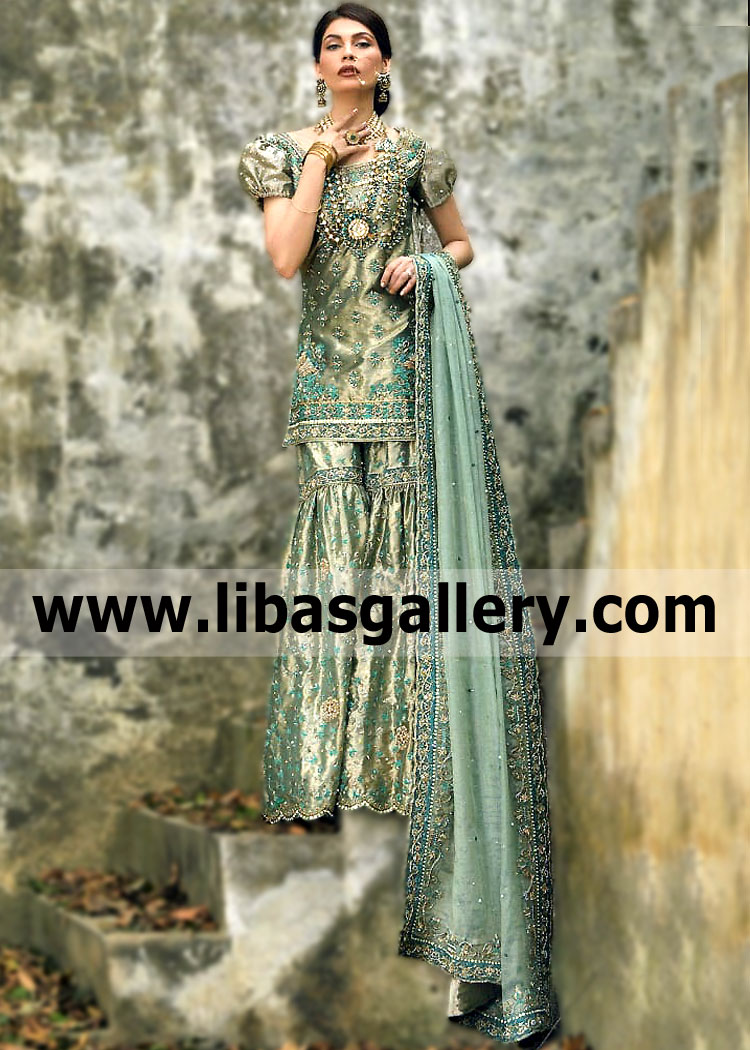 Dabka, stones, sequins, beads, silk threads and swarovski crystals. 100% pure highest quality imported fabric.
