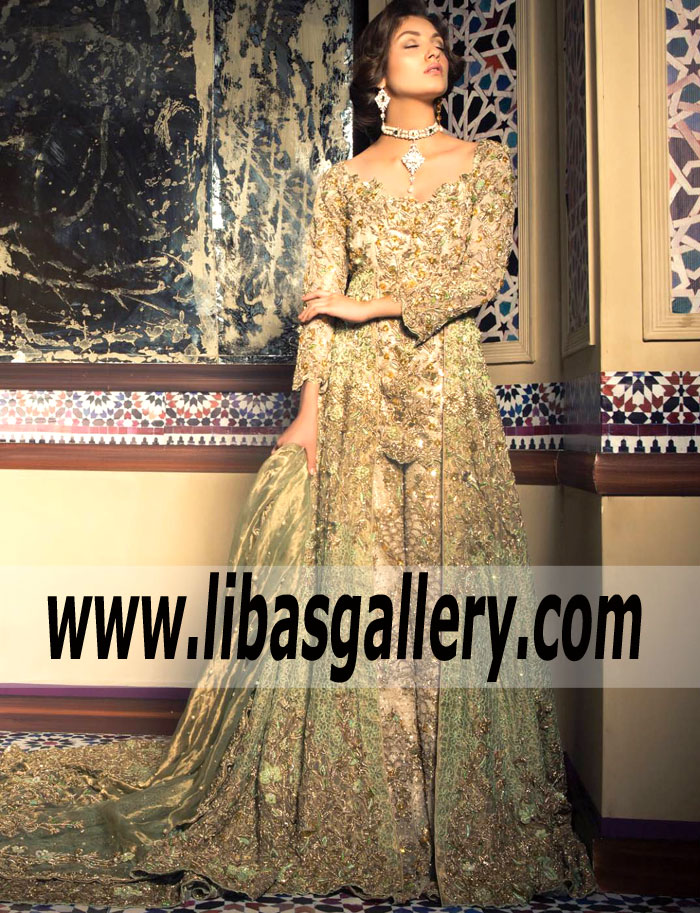 A fairytale romance awaits with this princess Dual layer bridal top. With a contemporary Dip-Dyed design and scalloped work border embellished two legged sharara, you`ll sparkle from every angle in this stunning bridal Dress.
