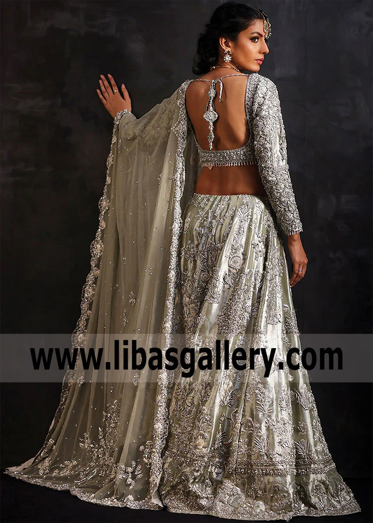 Note: The price of this Bridal dress includes only Light Moss Green tulle color dupatta. Extra charges will apply for the additional Lame dupatta Shawl.