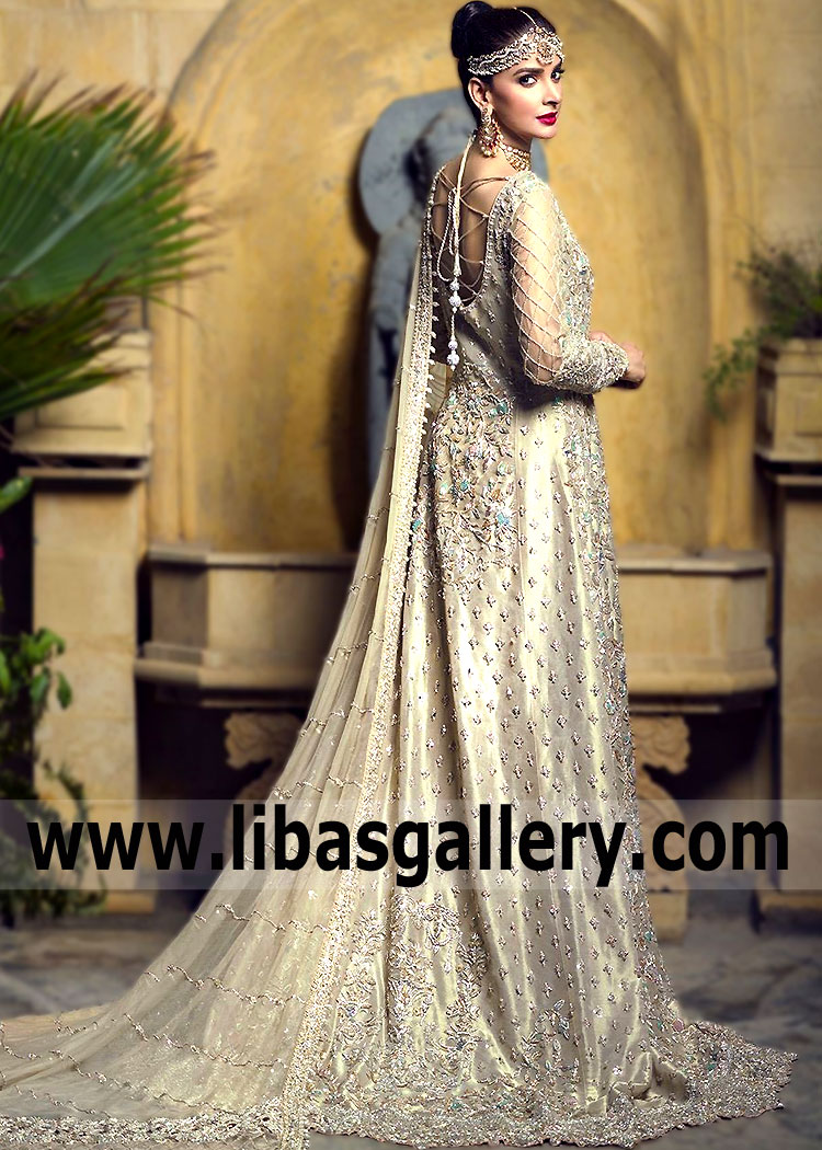 Floor length wedding pishwas adorned with exquisite embellishments and delicate scalloped work border
