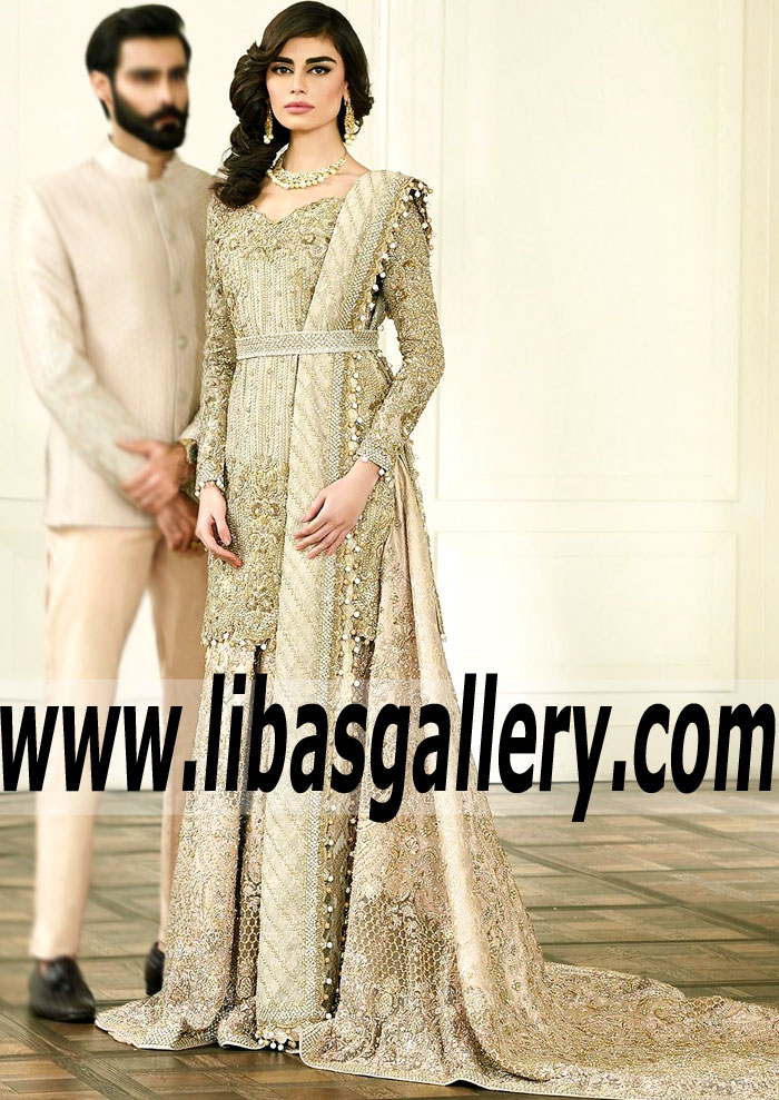 Feel the magic in this Sweetheart neckline wedding dress with sleeves is the sparkly, Pakistani Bridal look you’ve been searching for. The Chiffon Shirt features floral and stripes embellishments accentuates the neckline, front, sleeves and hemline, Full length sheer sleeves, Banarasi Jamawar flared sharara is adorned delicate and awesome embellishments accent the front and hemline, Dupatta contains embellished work border on edges, Lovely stripes and zigzag embellishments all-over, Dangling bead balls on edges, Scalloped edges And the entire dress is covered in a lovely floral embellishments and sparkling Embellishment work made with Dabka, stones, sequins, beads, silk threads and swarovski crystals. 100% pure highest quality imported fabric for an unforgettably traditional look. You’ll be covered from shoulder to toe give glimpses of your stunning beauty.