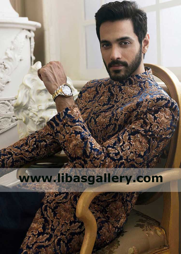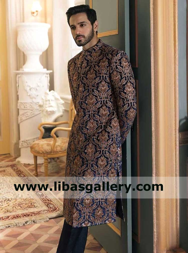 Blue Damask Hand Embellished Velour Fabric Sherwani for Men