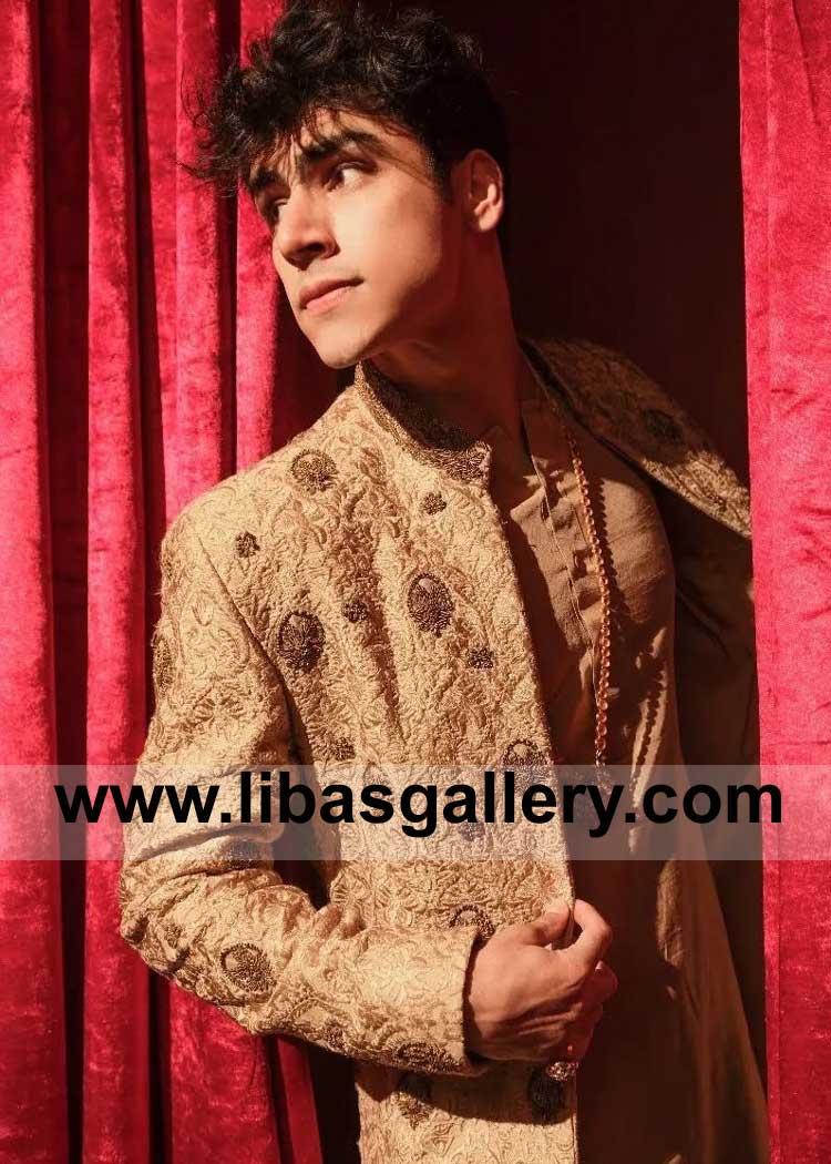Genuine Gold Stylish Sherwani for Men Nikah with elegance