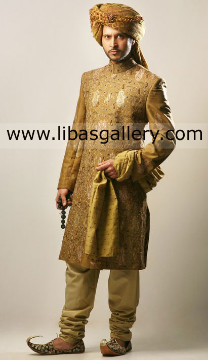 Pakistani Golden Sherwani Rich heart Groom