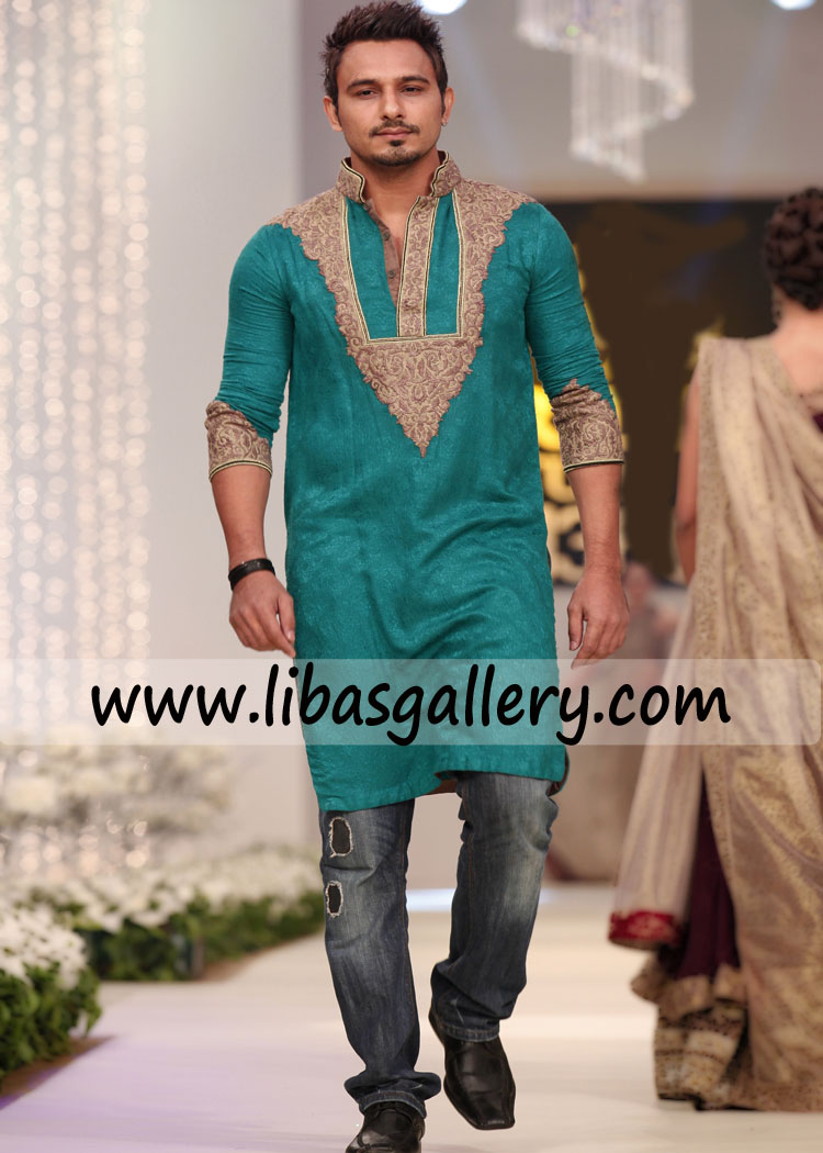 Pine Green Embroidered Mens kurta for mehndi