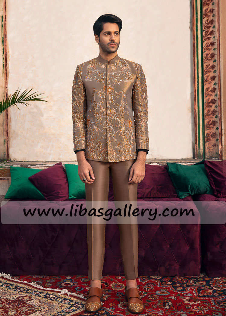 Thread work Bronze Prince coat for Groom Nikah