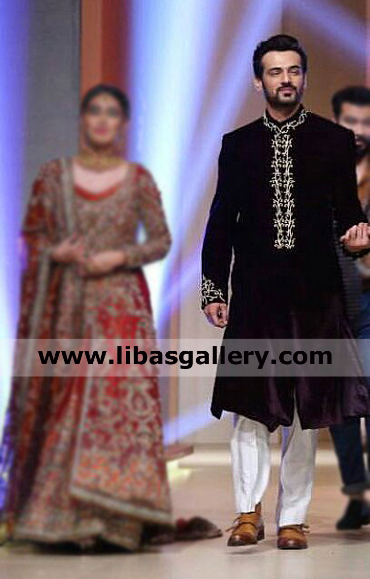 Winter Season Pakistani hand crafted groom velvet sherwani ensemble
