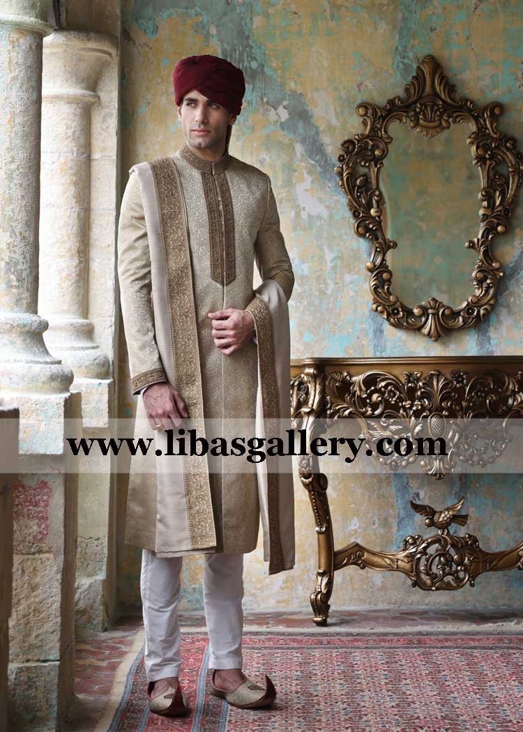 Beige Antique Embroidered Groom jamawar wedding sherwani