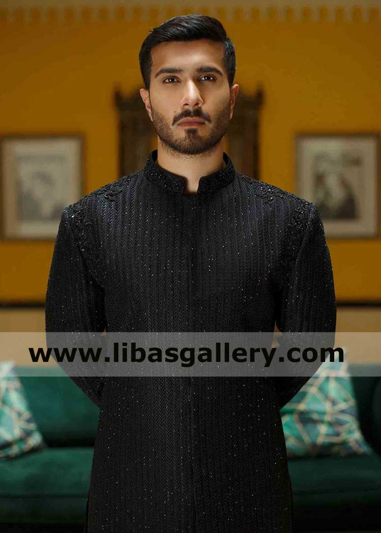 bespoke black Embroidered Groom Wedding jacket for nikah barat mehndi occasions
