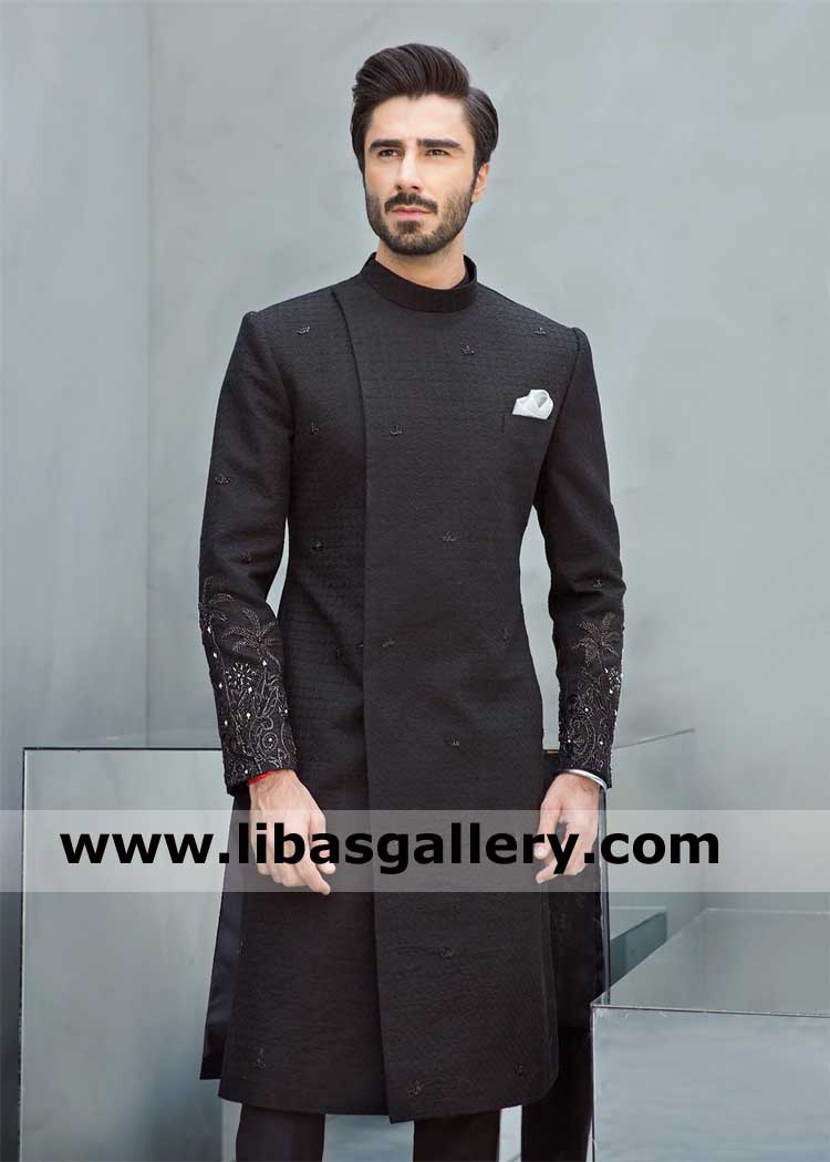 Black Chikankari Groom wedding sherwani glamorous modern uplifting