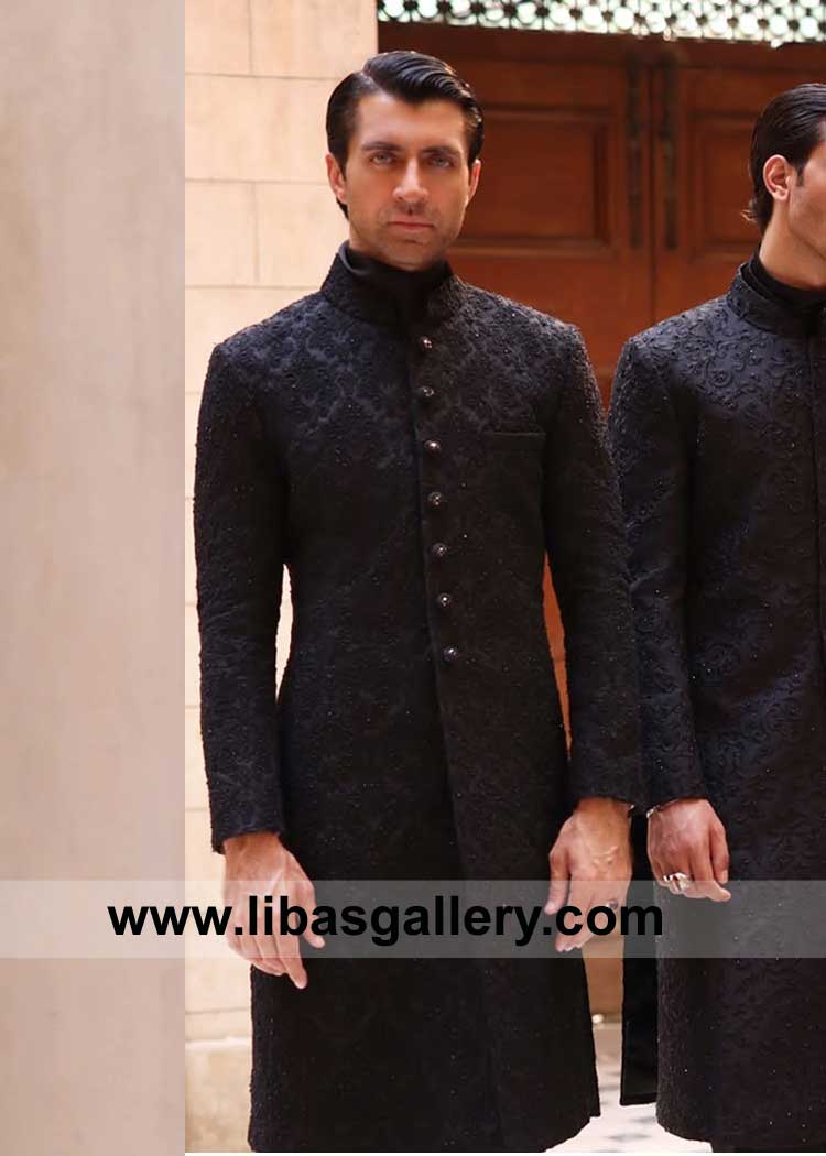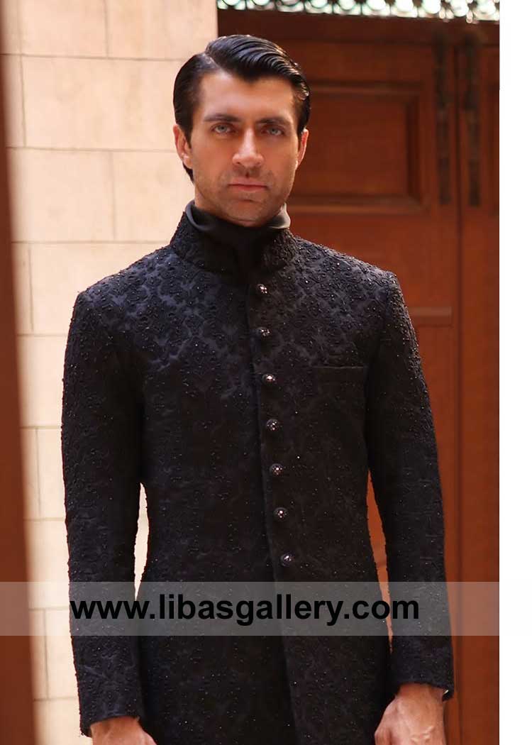 Black Refined Self embellished Groom Wedding Sherwani Style