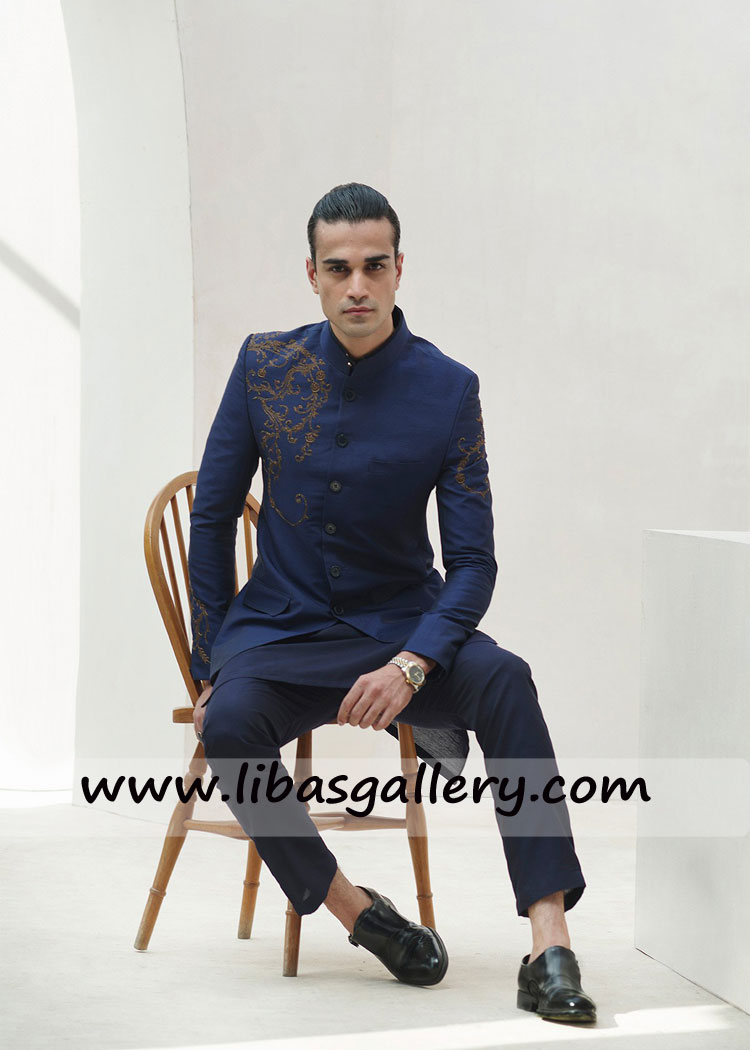 BLUE RAWSILK HAND EMBROIDERED Groom PRINCE COAT