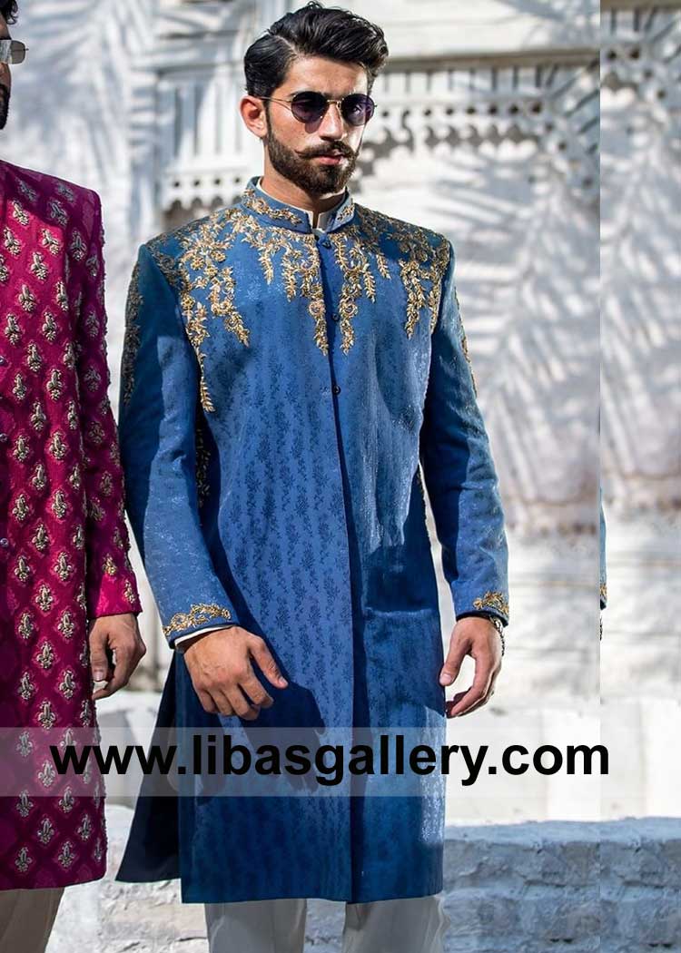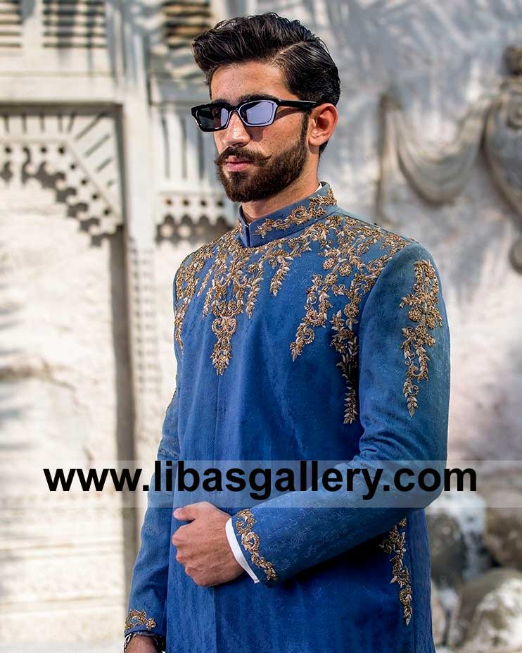 Bright Blue Men Wedding Sherwani Style Hand Embroidery on Karandi