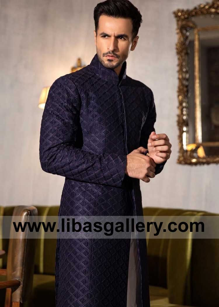 Dynamic Deep Blue Raw Silk Men Nikah Sherwani