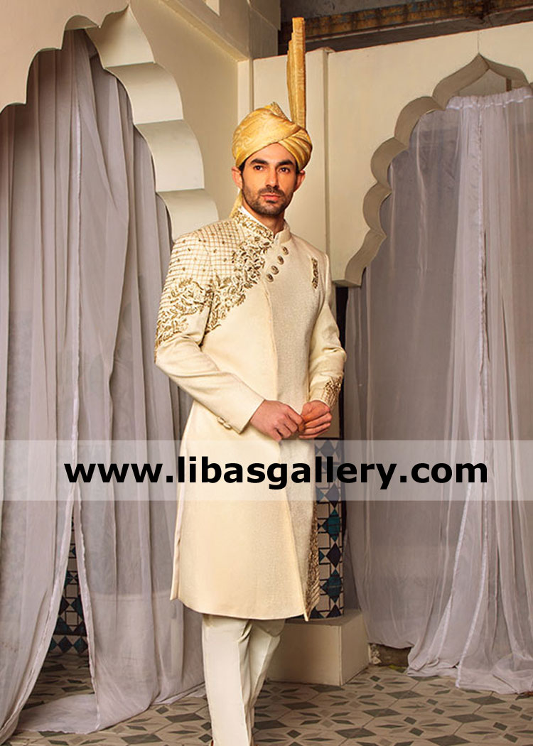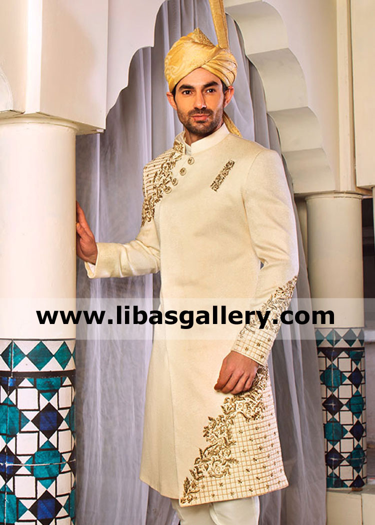 Ivory gold side cut groom wedding sherwani for nikah occasion