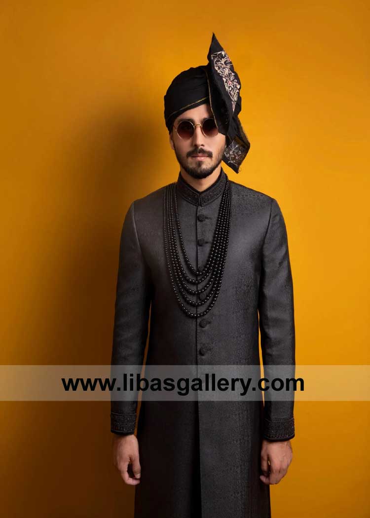 Magnificent SELF WEAVED CLASSIC BLACK SHERWANI for Groom