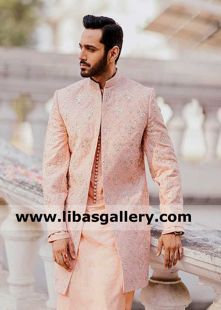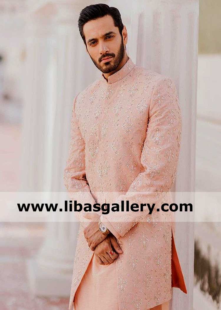 Men Embroidered Peach Pink Wedding Sherwani Suit