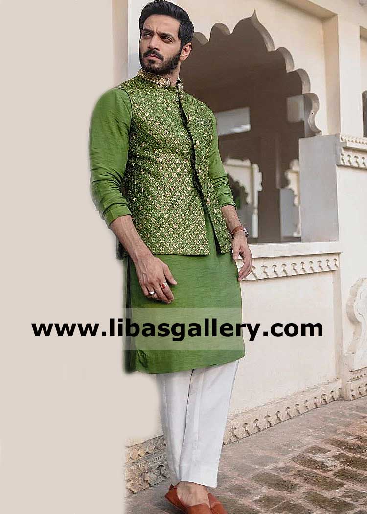 Men Lush Green Raw Silk Embellished Waist Coat for Mehndi