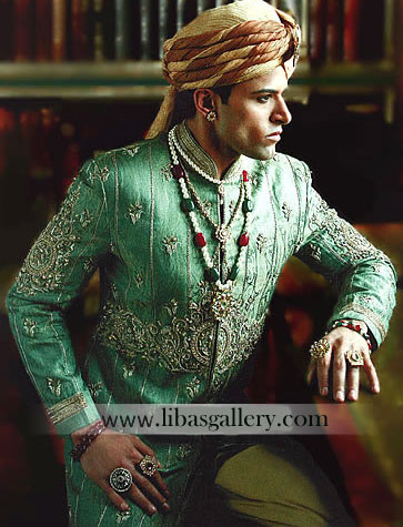 Royal wedding sherwani for decent looks is beautifully designed in Sea green color with elite quality embellishments on collar, front closure and sleeves. Small sized ornamental motifs are embroidered beautifully to give a lavish look. Fabric used is banarsi.