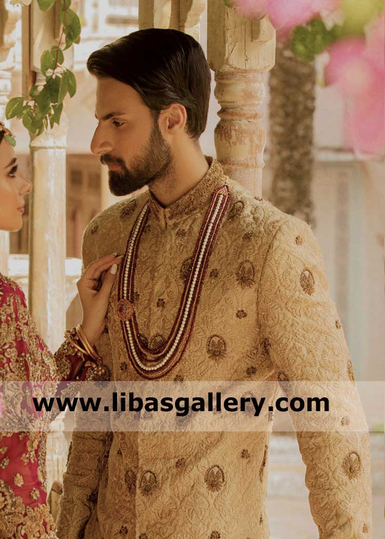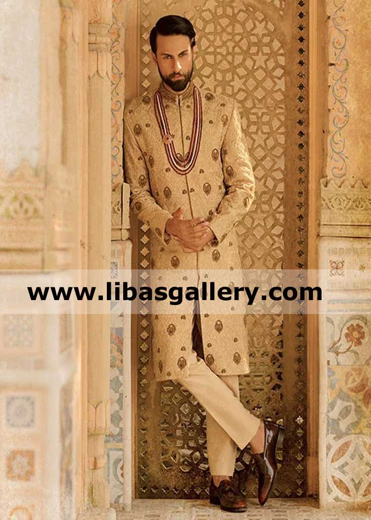 Traditionally embroidered beige groom wedding sherwani