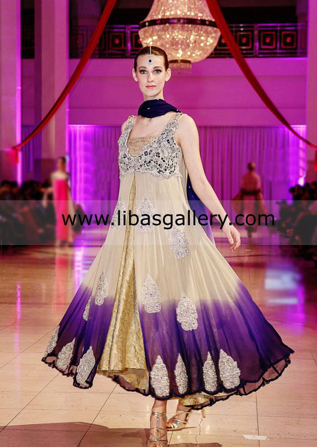 Beige and Purple dip dye chiffon Anarkali dress has a beautifully embellished