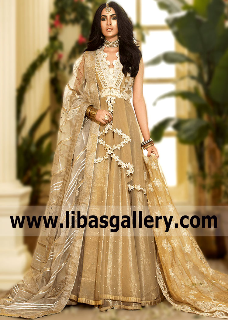 Note: The price of this dress includes only 1 Dark champagne color dupatta which is on the right shoulder of the model. Extra charges will apply for the additional Buff color dupatta which is on the left hand of the model.