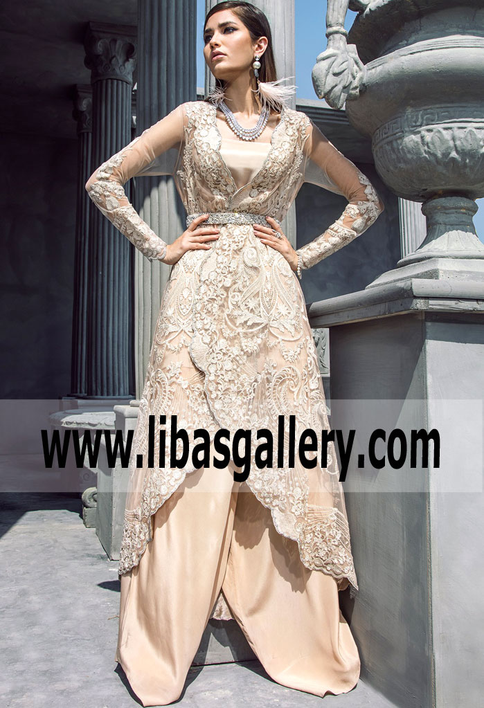 Sparkling long top features dazzling and floral embellishments accentuates the neckline, front, sleeves and delicate scalloped work border on front borders and hemline