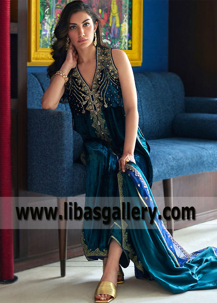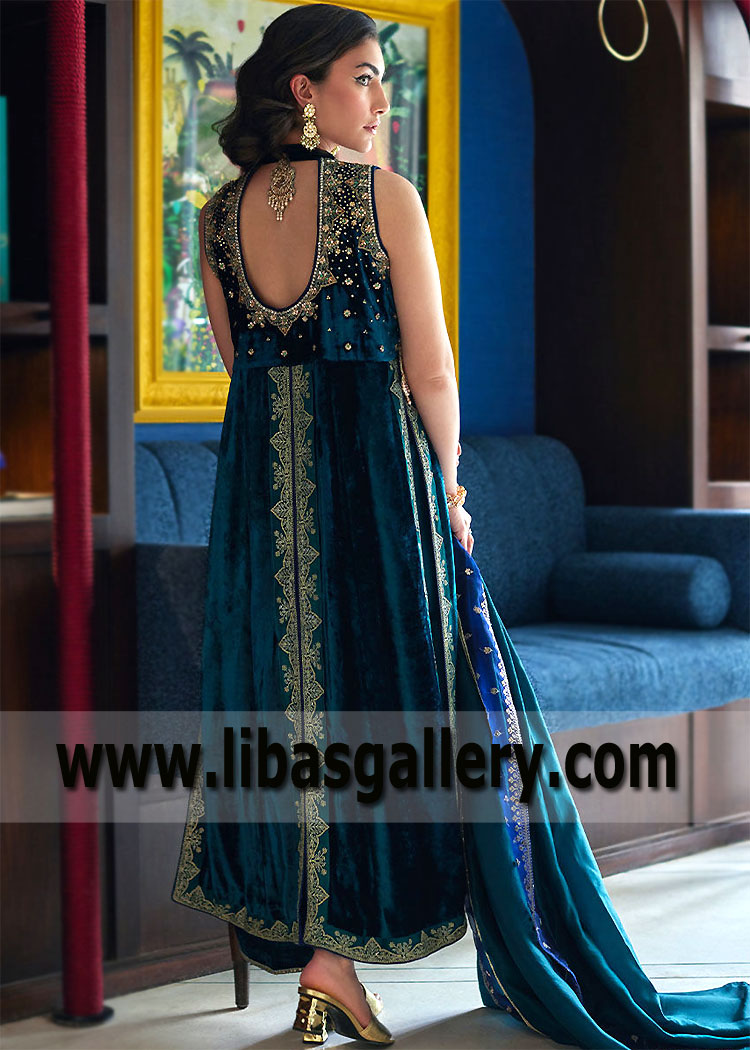 Deep Teal Mallow Velvet Formal Dresses Pakistan