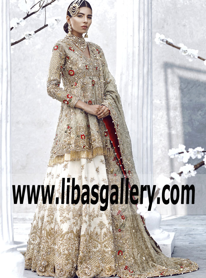 Timelessly elegant, this sparkling new Anarkali Peplum features a contemporary & girly embellishments, Comes with marvelous Lehenga is adorned glorious and awesome embellishments finished with beautiful Banarasi Jamawar. Perfect for any modern day bride.