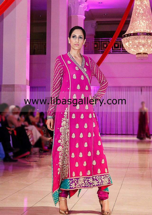 • Hot pink chiffon Angrakha dress has beautiful floral