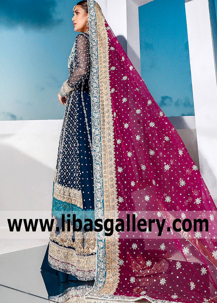 Long length bridal maxi adorned beautifully with alluring and dazzling embellishments accent the neckline, front, sleeves and applique work border on hemline