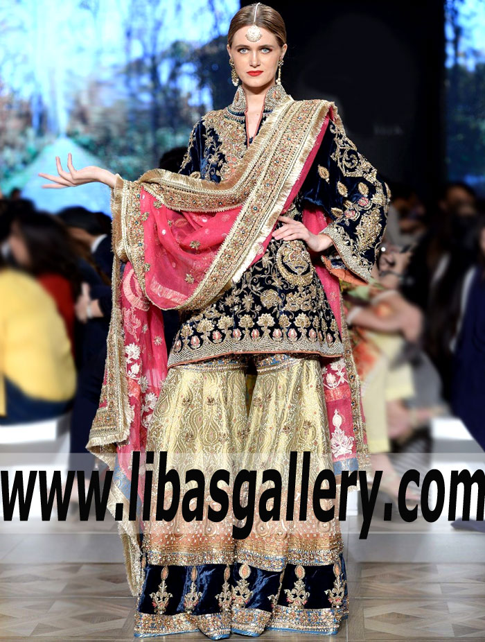 If this wedding dress could talk, it`d say "the queen has arrived!" With its short shirt features intricate floral embellishments on Stand collar with around the V-front neck, Big sized motifs on side and heavy floral hemline, Full sleeves, Two legged flared Gharara in Banarsi Jamawar fabric, rich detailed embellishments on the hem, and Chiffon dupatta has embellished border in gold, this wedding gharara has a regal feel. feel beautiful inside and out with Golden Zircons, kundan, faux gemstone and fresh water pearls jhoomar, tika and pair of earrings jewellery.