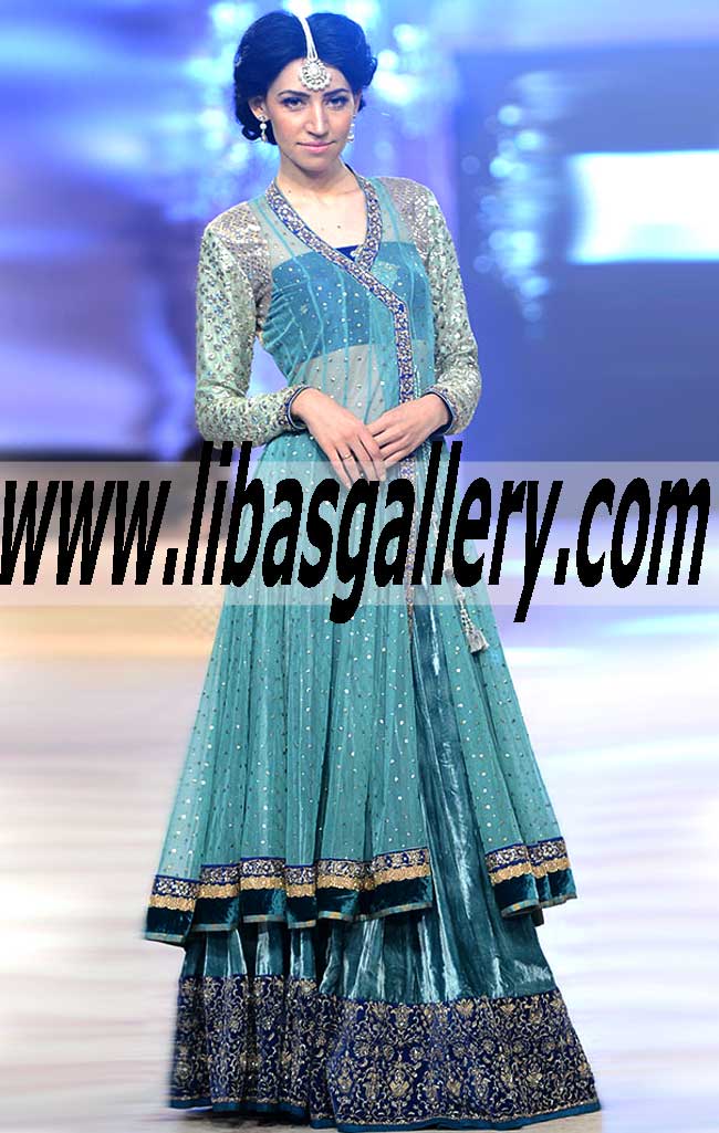 Spectacular Verdigris color Angrakha Dress with Lehenga for Wedding and Special Occasions
