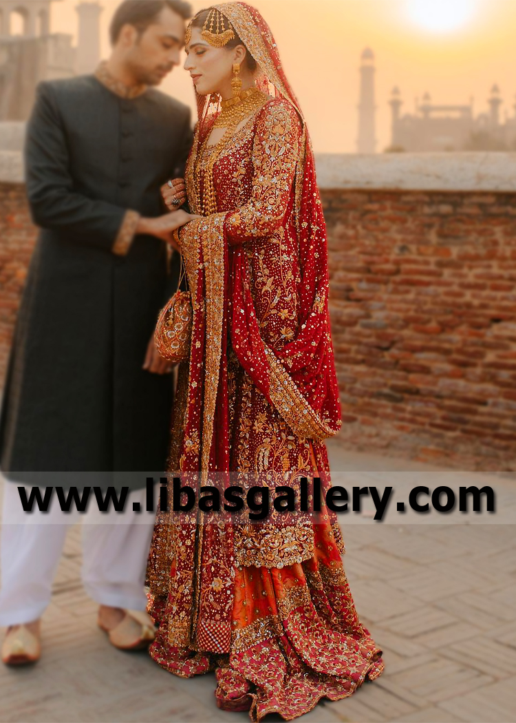 Splendid Red Orange Bridal Gharara Dress for Wedding