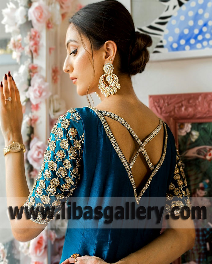 Dabka, stones, sequins, beads, silk threads and swarovski crystals. 100% pure highest quality imported fabric.