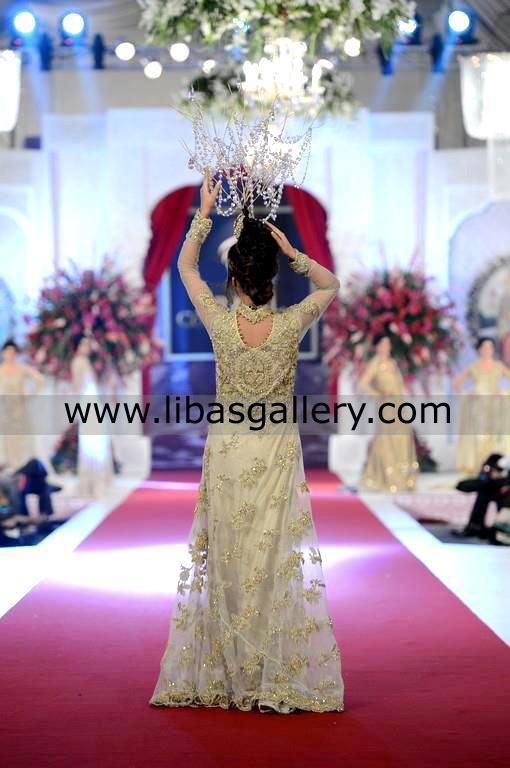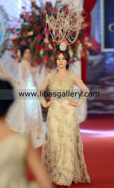 Gown: Off White Gold chiffon/Net long gown has heavyEmbellished yoke bodice.