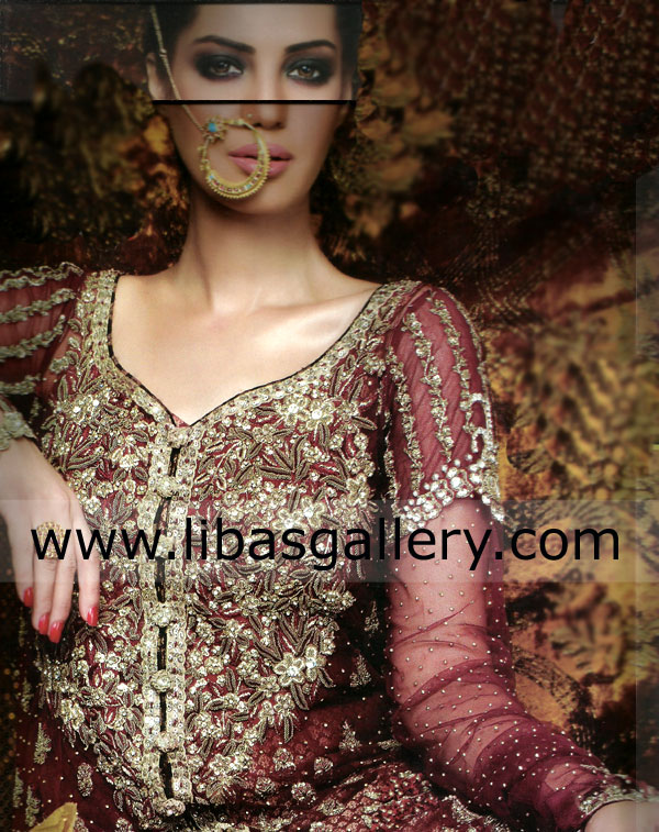 Sequins, beads, dabka, threads and swarovski crystals.