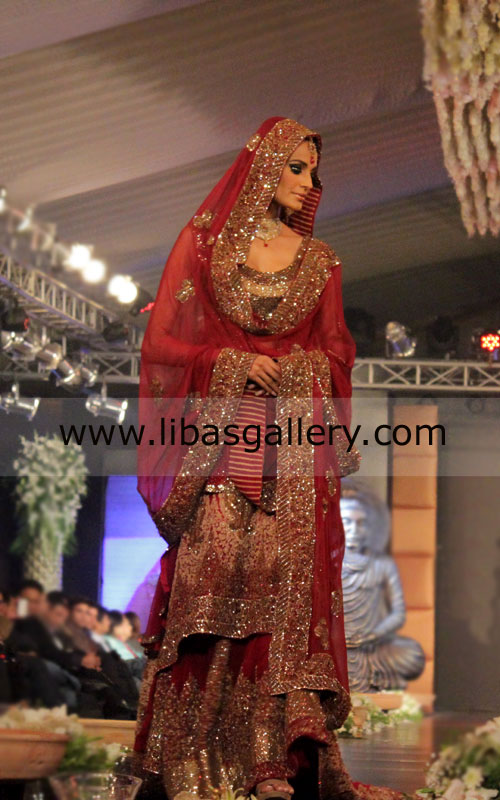 Skirt/Gharara: Ruby red atlas textured jamawar flared sharara has been heavily embellished with wide traditional borders all around. Piping edges finish.