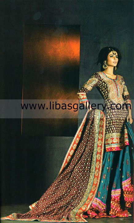 Bottom: Dark turquoise crinkle chiffon flared lehenga has colorful