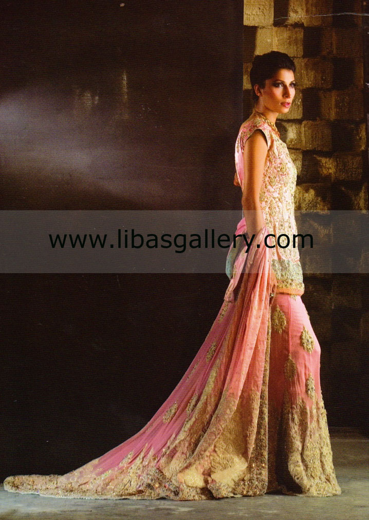 Shawl/Dupatta: Baby pink chiffon dupatta has wide heavy embellished border all around with big traditional ornamental motifs scattered all over. Heavy sequins shower. Lined where required. Piping edges.