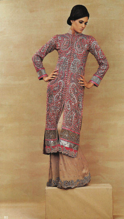 Top: Electric crimson crepe silk long shirt has been embellished lavishly with whimsical and floral