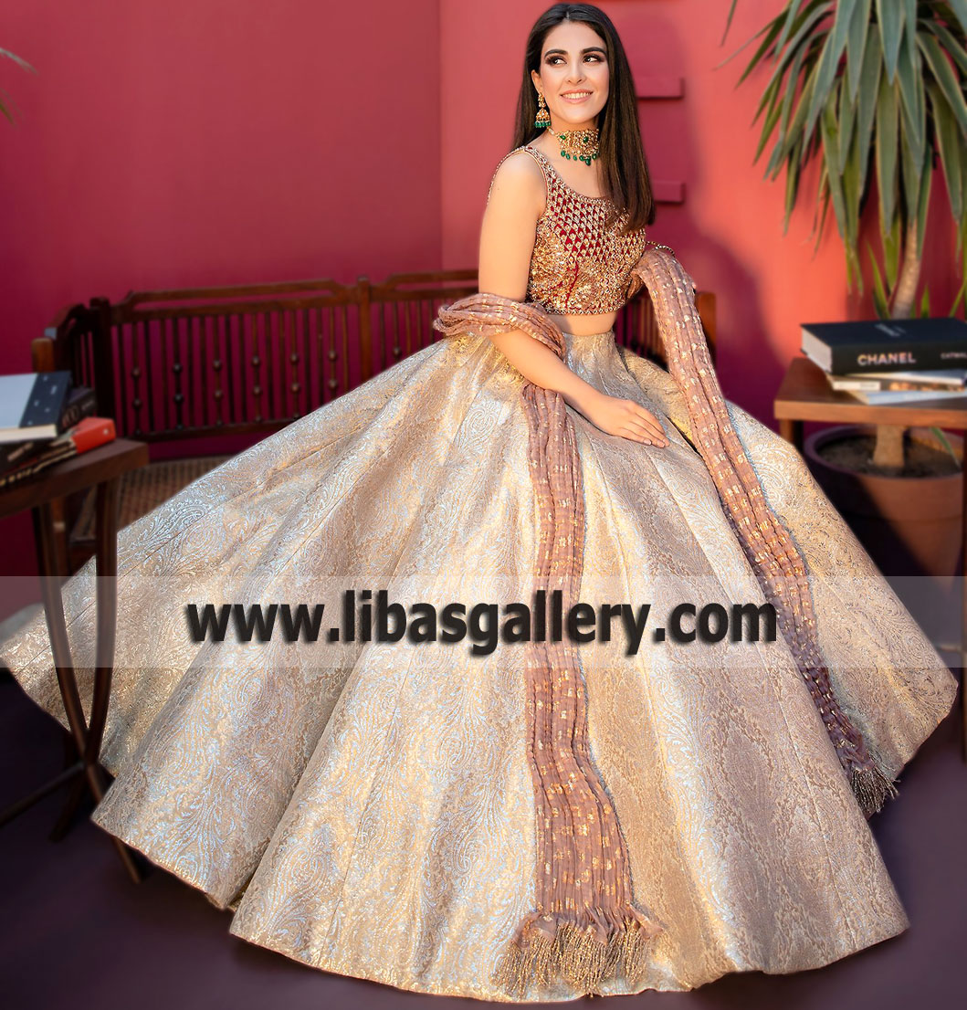 Dabka, stones, sequins, beads, silk threads and swarovski crystals. 100% pure highest quality imported fabric.