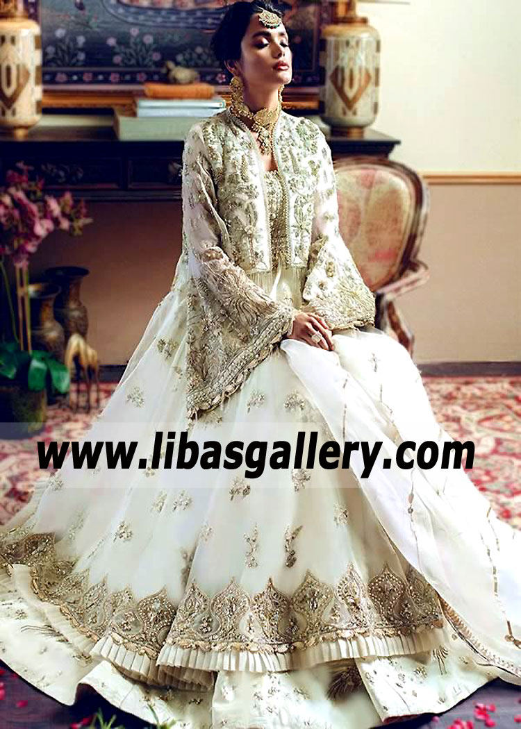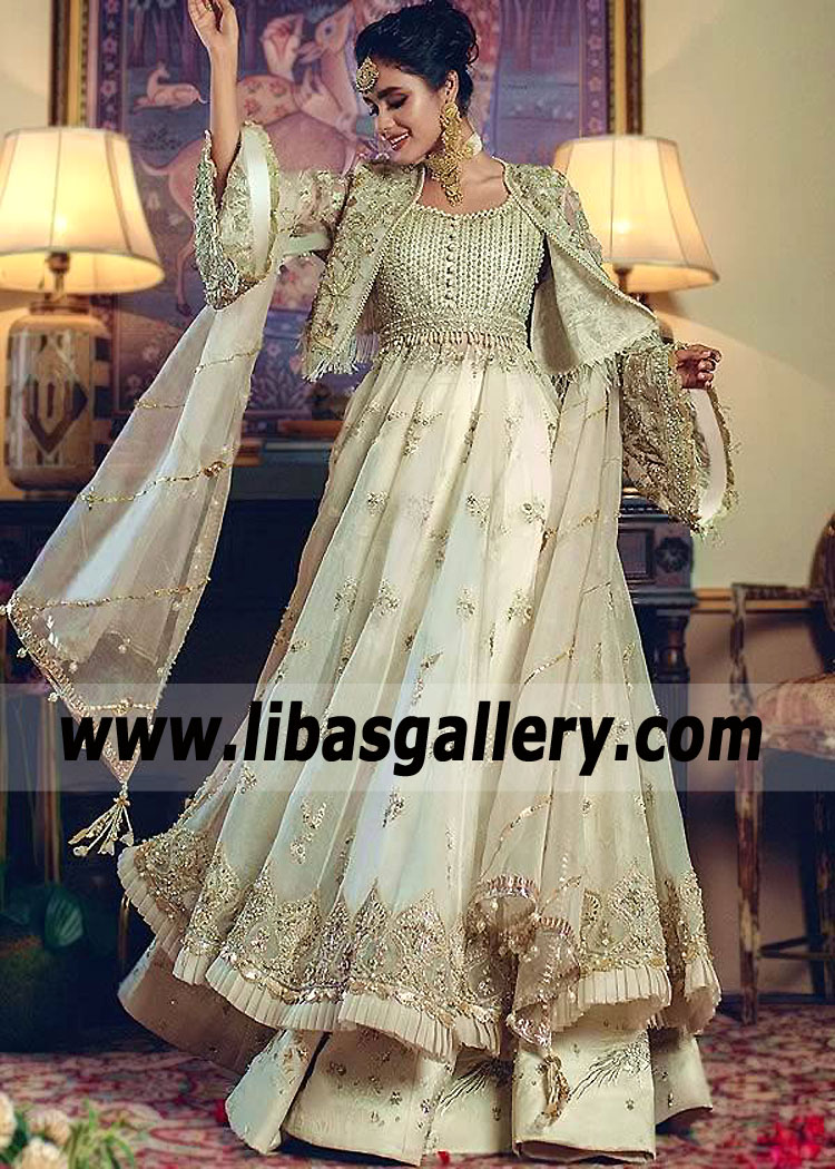 Radiant on your big day! Its romantic Anarkali style With Embroidered Bolero Jacket and floral embroidery are the perfect combination.